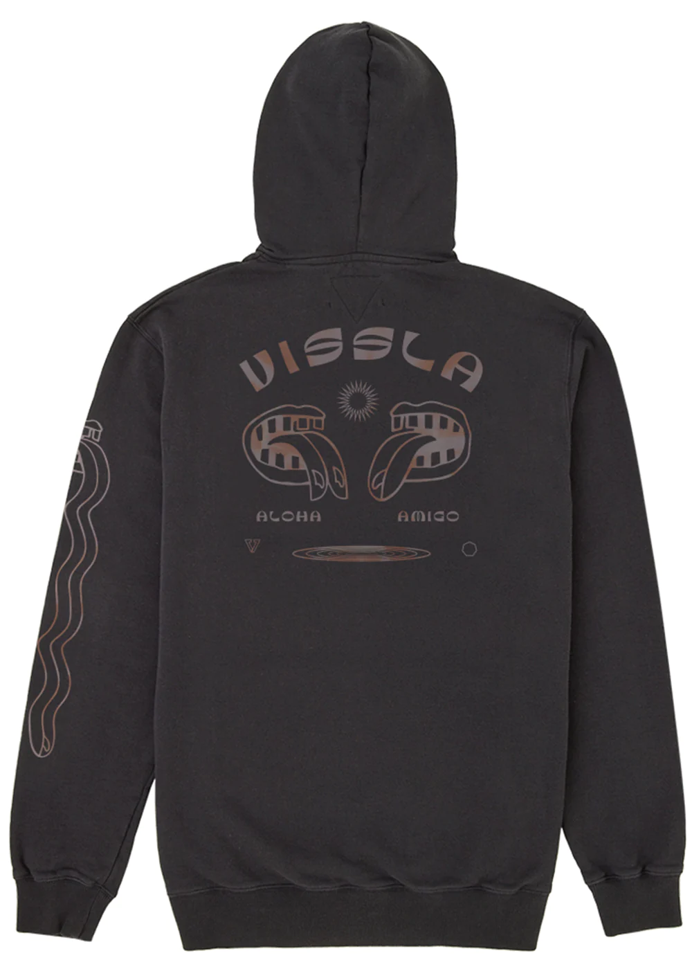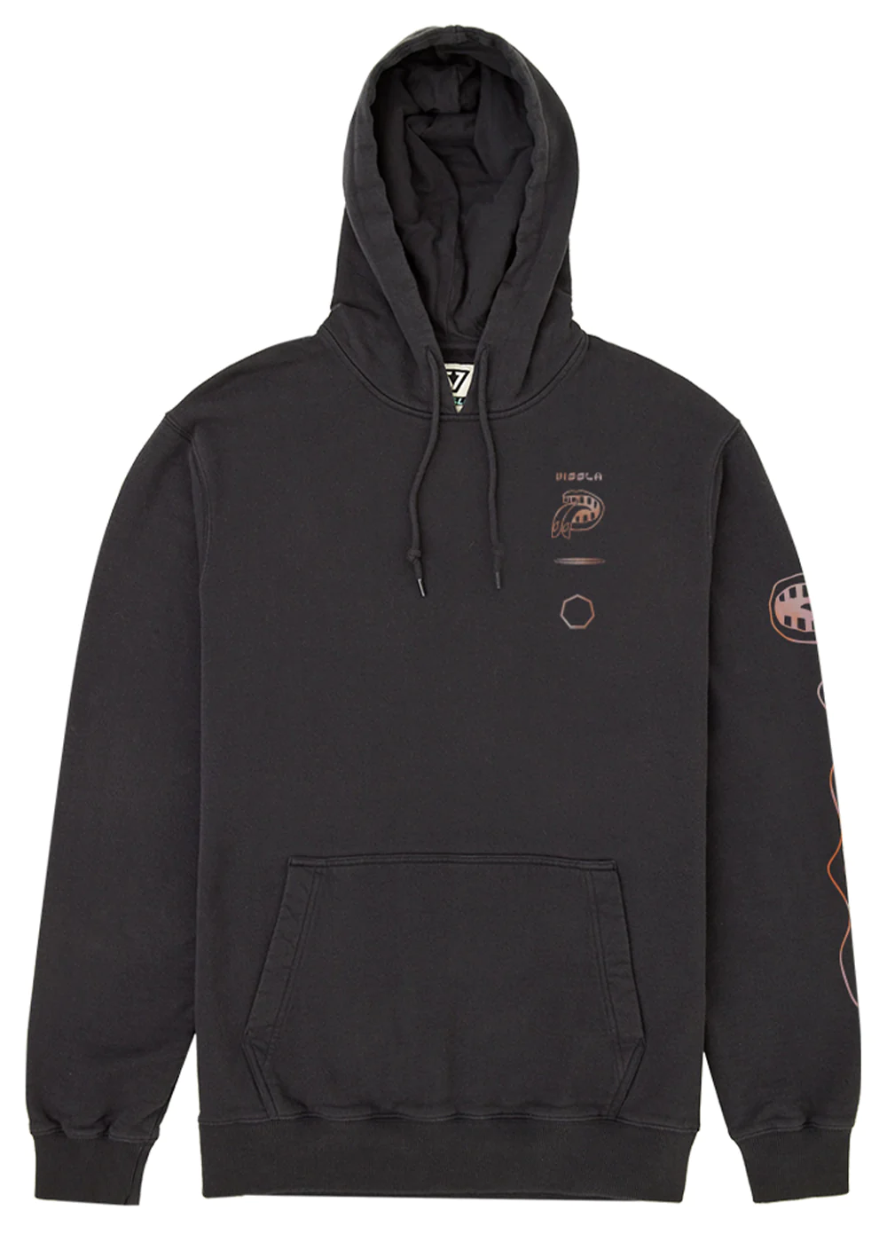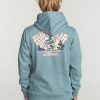 Se trata de un forro polar con capucha de 300 g/m² cepillado con tratamiento de lavado al ácido para un aspecto de lavado destruido y un estampado delantero y trasero.